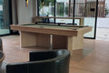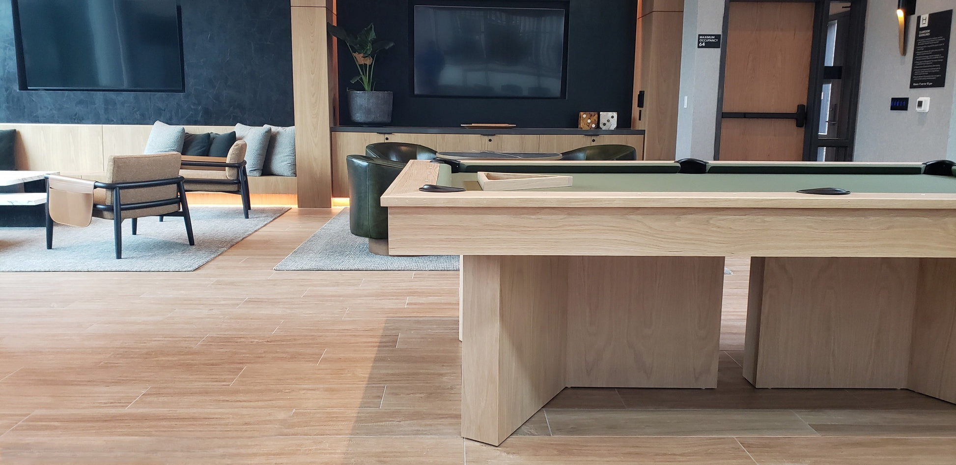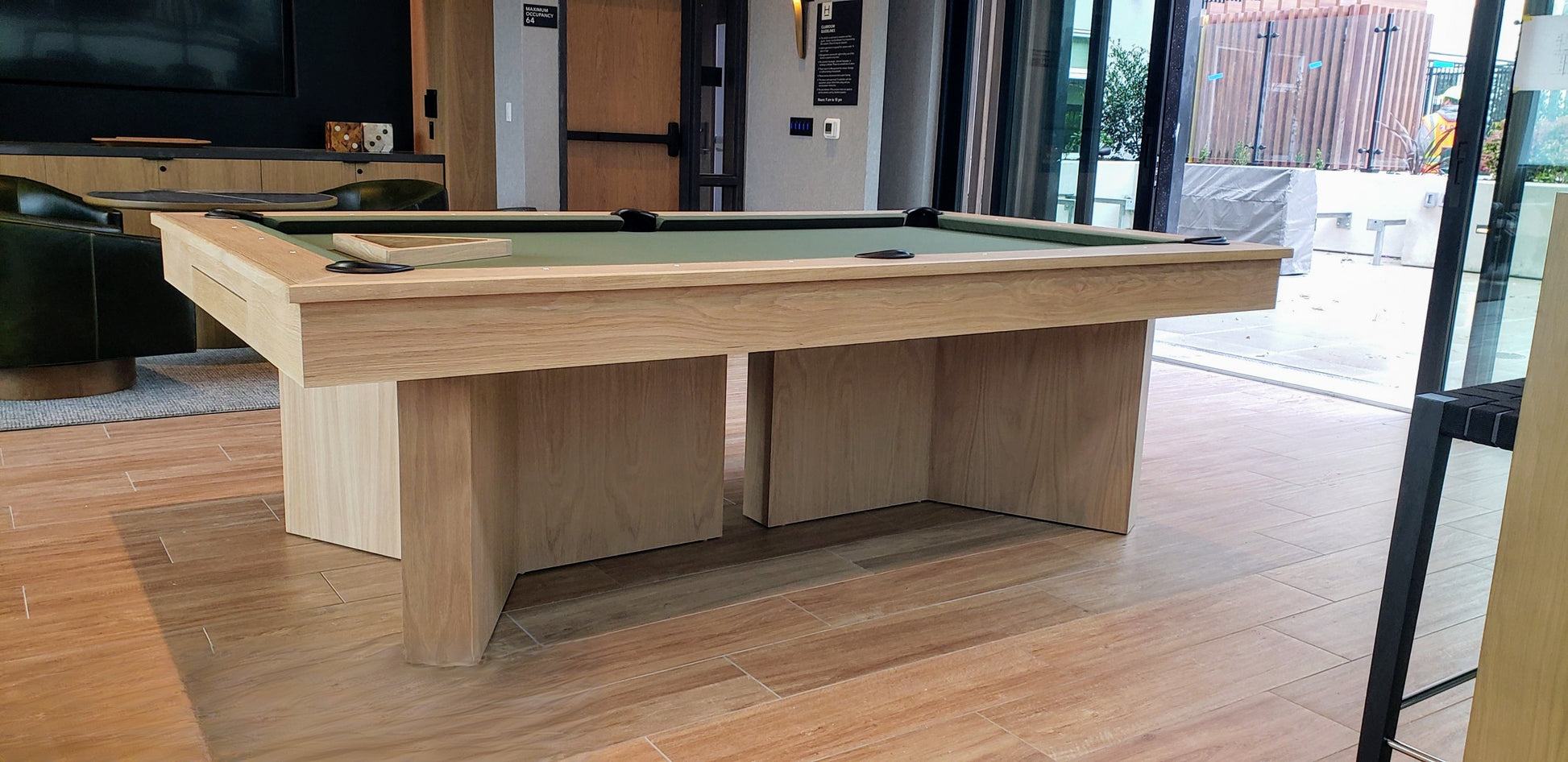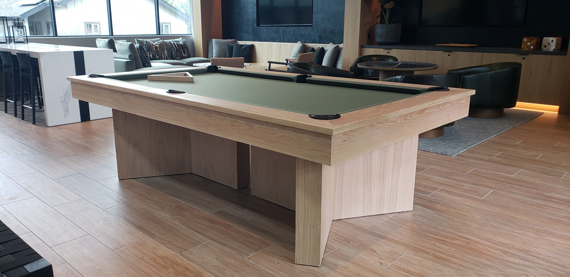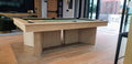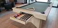 I see you checking out the Regency pool table. This beauty is crafted right here in British Columbia, showcasing a stunning White Oak finish – but don't worry, we can customize it with any of our West Coast wood stains to perfectly match your home's décor.