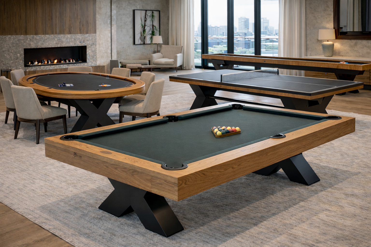 Our ping pong tables can also be built as part of a cohesive room concept — matched alongside pool, poker, and shuffleboard so every piece shares the same wood tone, base design, and visual language.