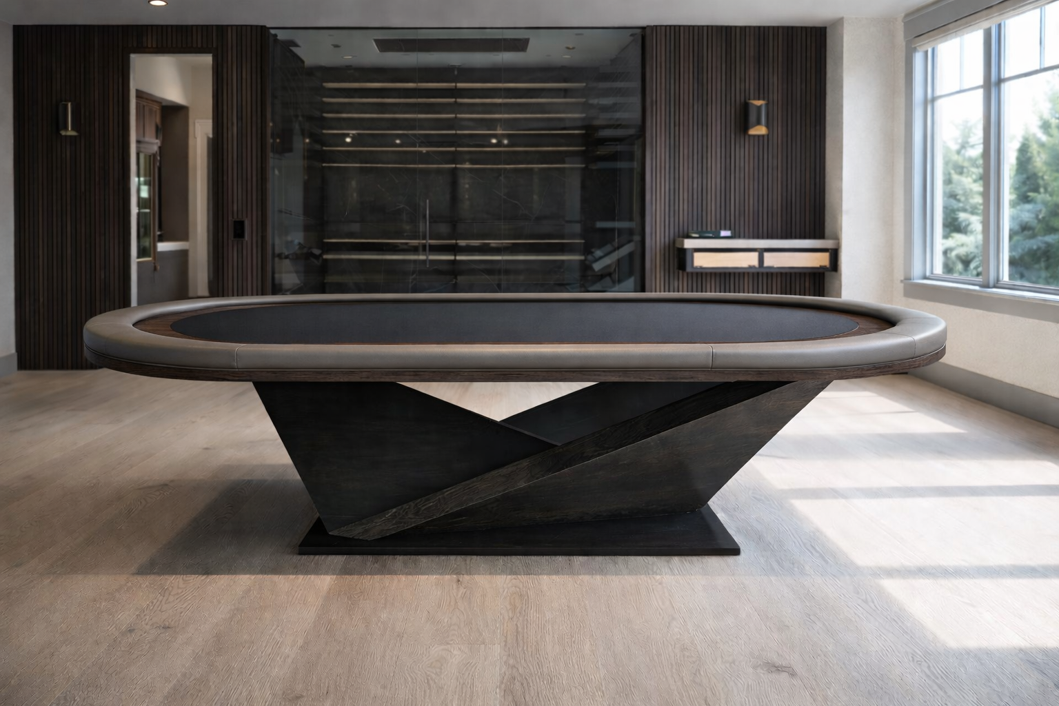 The Origami Poker Table elevates game night with a masterful blend of sculptural design and premium performance. Built around the same striking folded triangular base geometry as our Origami Pool Table, this poker table exemplifies architectural precision and refined materiality — a true centerpiece for modern homes, lofts, and game rooms.